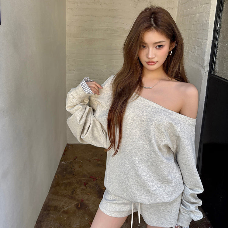 三流之路拼接露肩衛衣短褲兩件套-25567