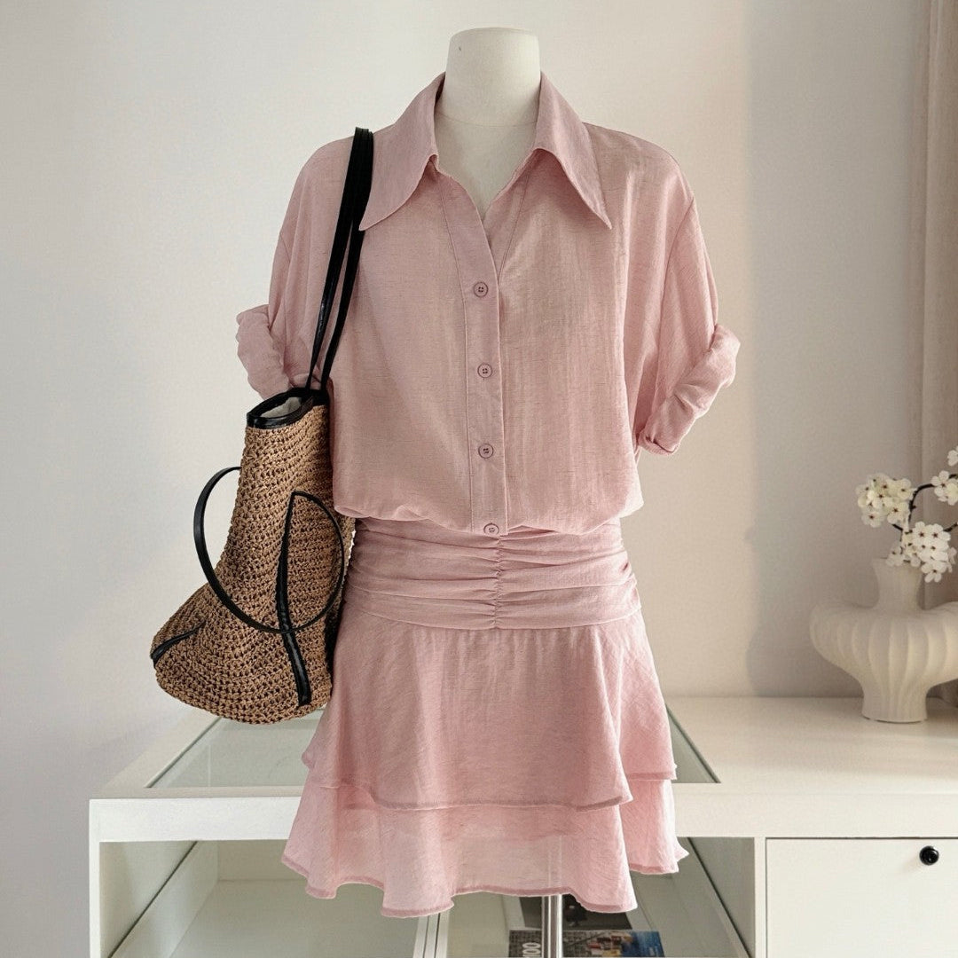 初次約會粉色亞麻襯衫短裙兩件套-25586