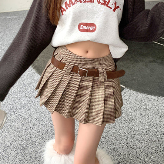 卡其千鳥格紋百褶裙-25556