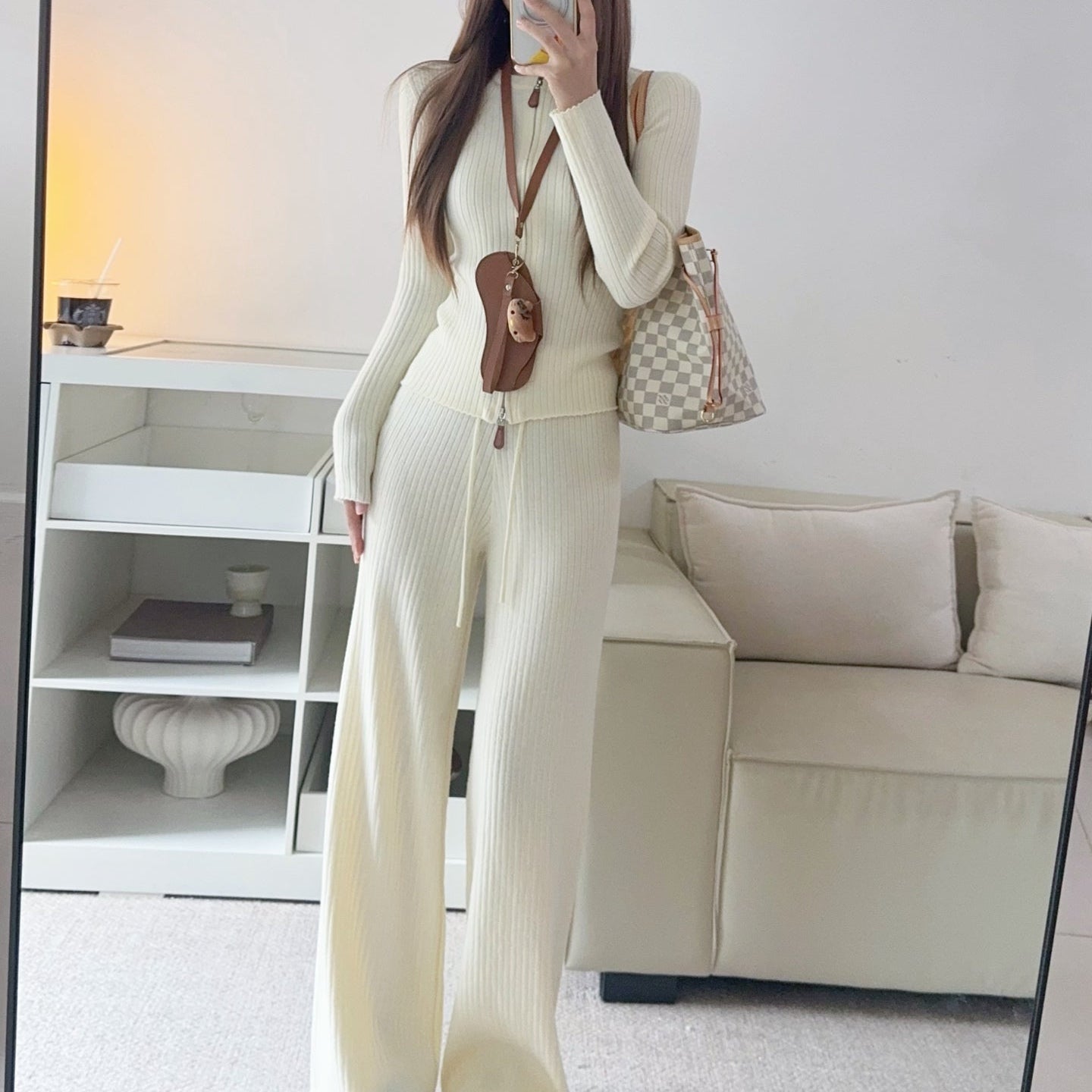 拉鍊坑條針織外套鬆緊高腰直筒長褲套裝-25676