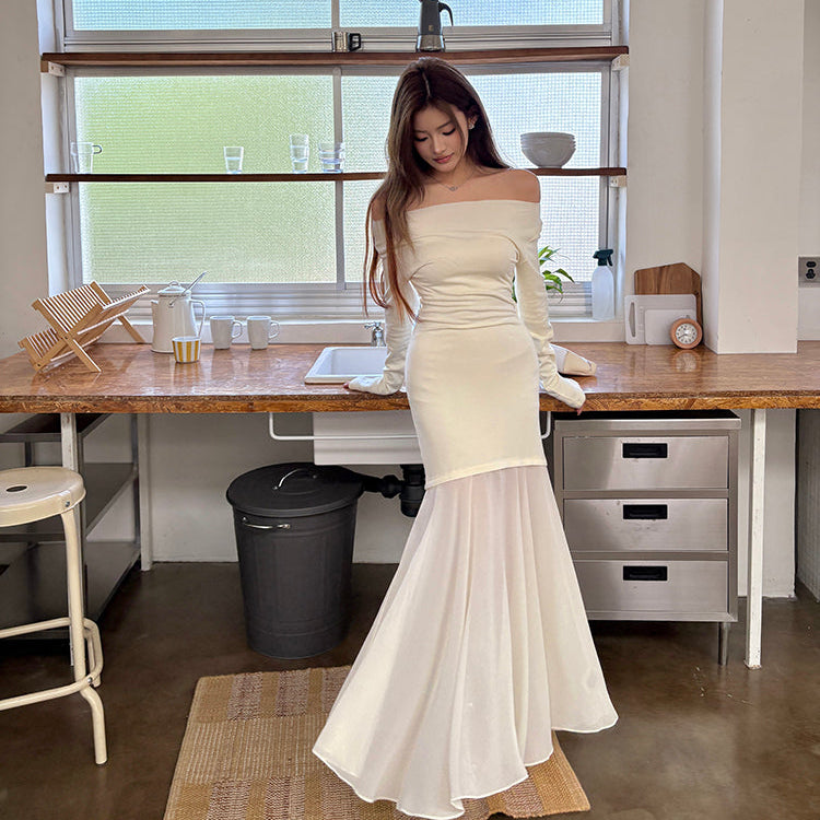 曉寒輕一字肩雪紡拼接包臀魚尾長洋-25564