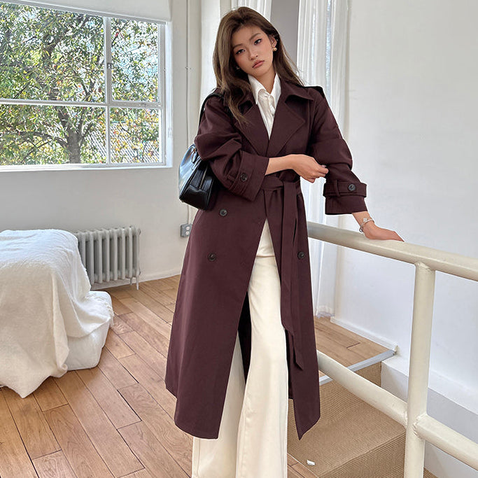 棕紅高級感雙排扣中長風衣-25652