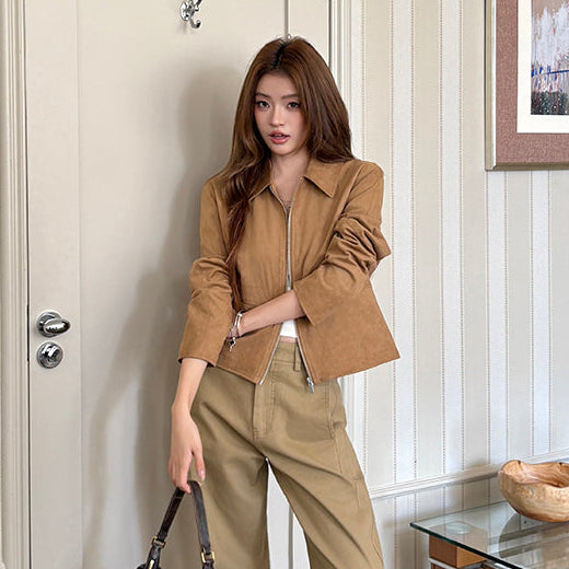 復古感牛皮絨材質,挺版設計修飾身形,立領拉鍊細節增添帥氣感,深卡其色系百搭質感,展現俐落率性風格。