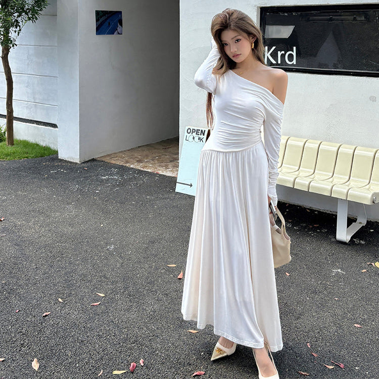 斜肩設計搭配綁帶露背剪裁,輕盈飄逸中展現柔美性感。