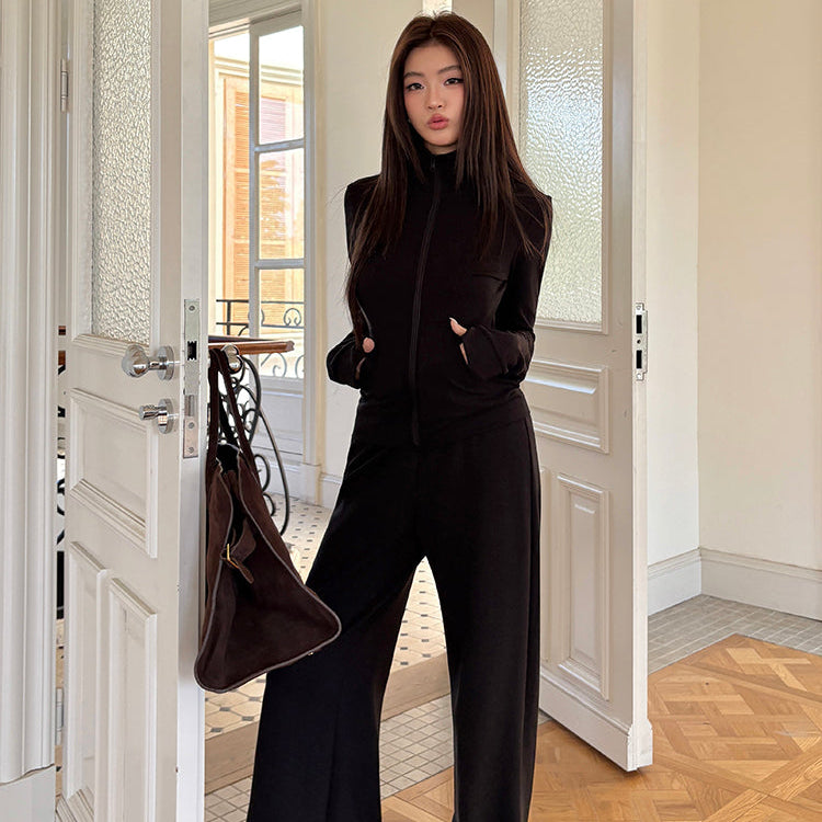 秘密同盟黑色立領修身外套寬褲兩件套-25636