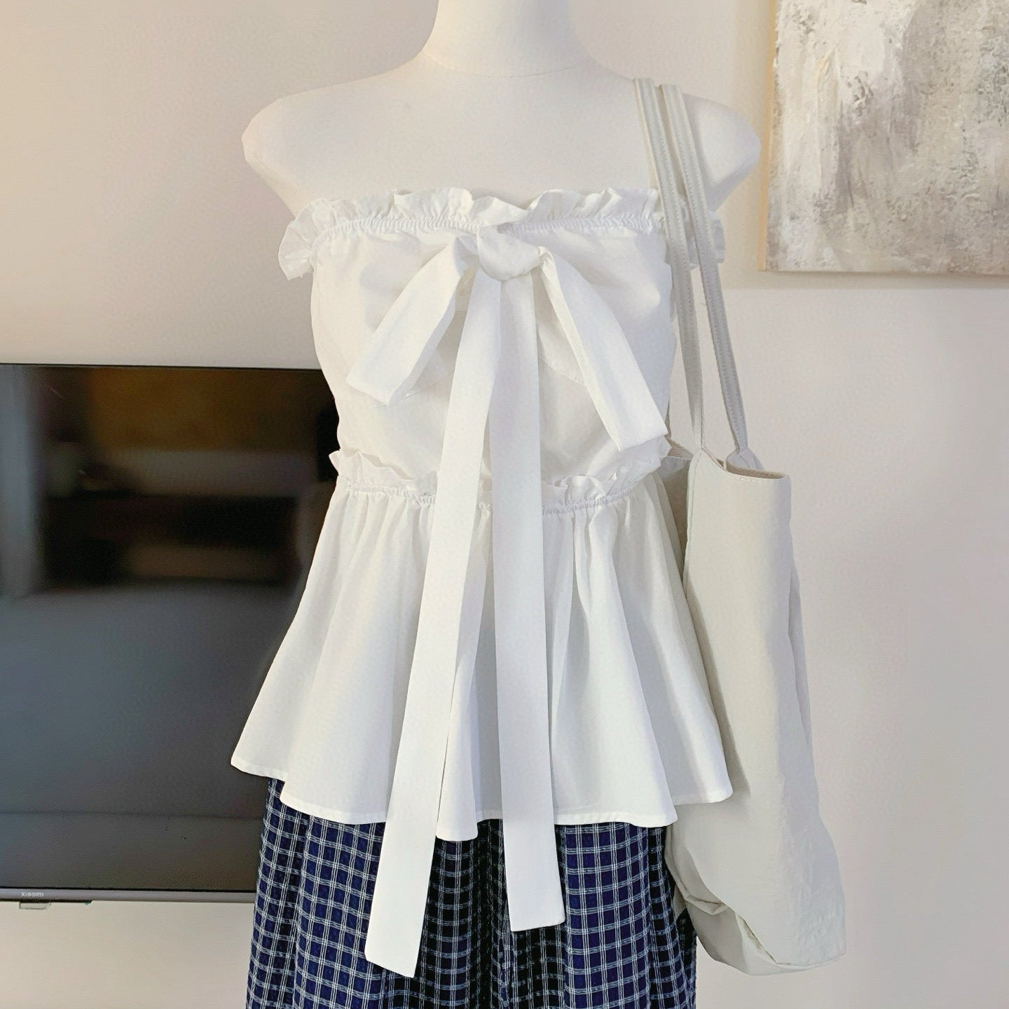 露肩蝴蝶結設計輕盈又甜美,荷葉邊與收腰剪裁勾勒溫柔曲線,清新純白感自帶氛圍美感。