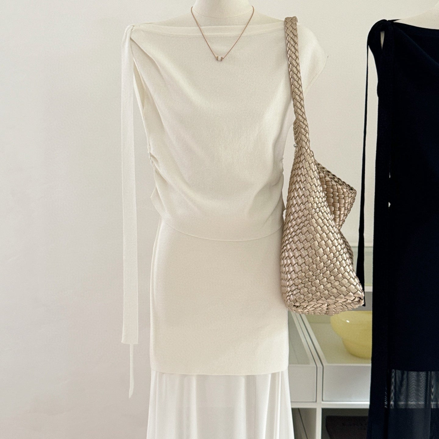 針織背心高腰牛奶絲長裙飄帶套裝-25585