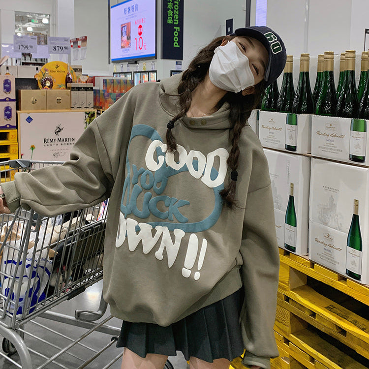 GOOD LUCK美式復古加絨連帽衛衣-25629